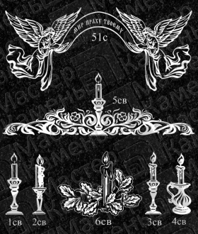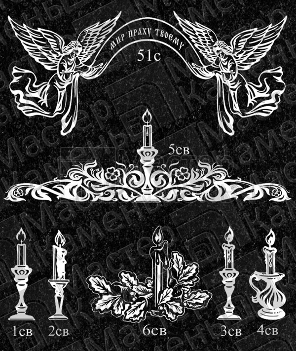 Ритуальная символика с ангелочками очень хорошо смотрится верхней части камня, над фотографией, а орнамент со свечой лучше расположить по низу. Прямоугольные рамочки можно использовать как вокруг самой фотографии, так и по краю камня.